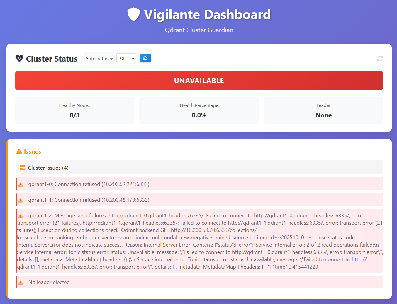 We are currently working on a cluster guardian solution, we call it Vigilante, this solution offers a cluster dashboard with some convenience features available by single button press. I will show screenshots from our 3-node development cluster.