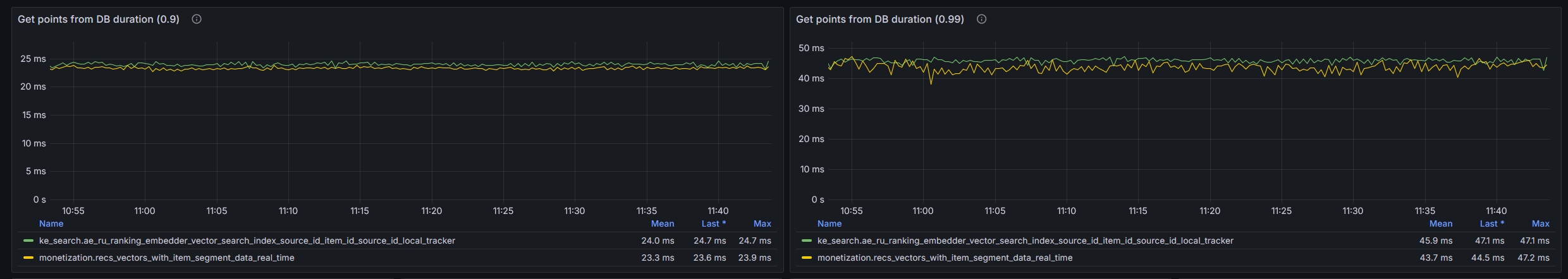The first load stage – points insert to the unindexed collection – does not affect response times at all, but when the HNSW index build kicked off, we noticed at least twofold increase in response times.