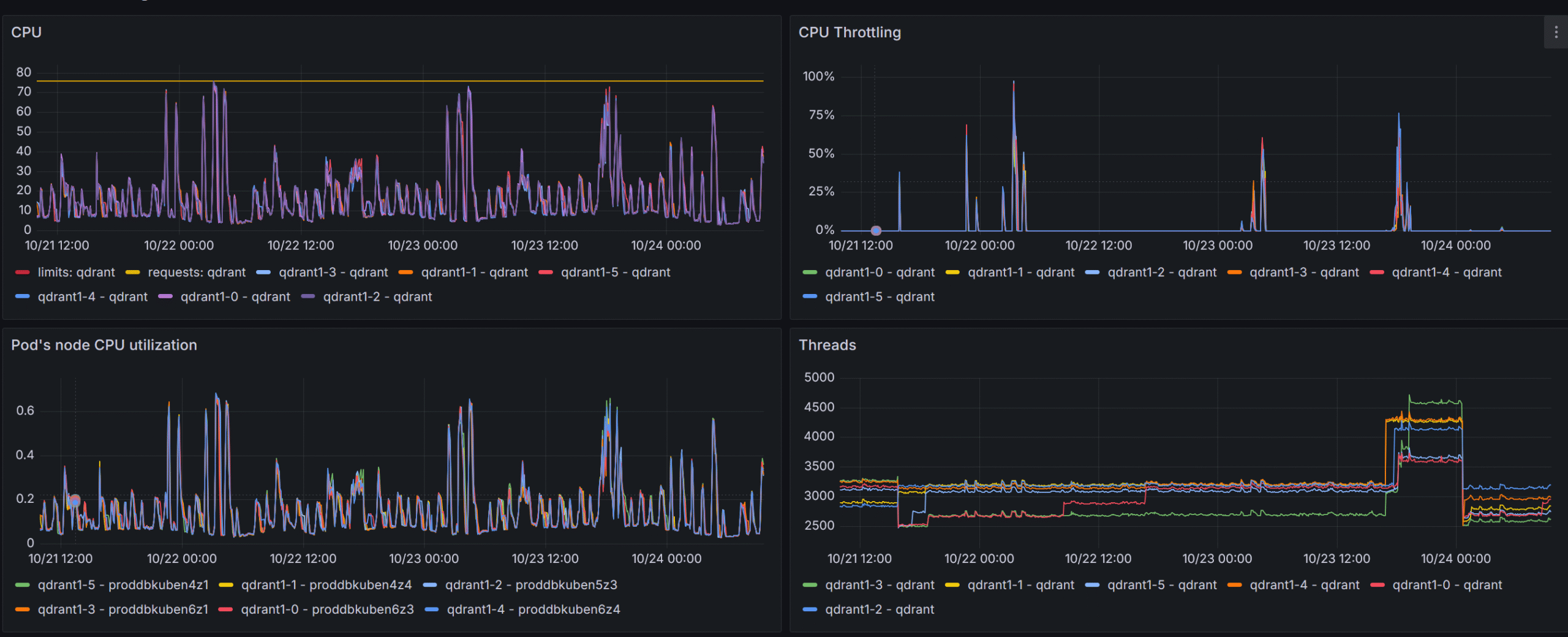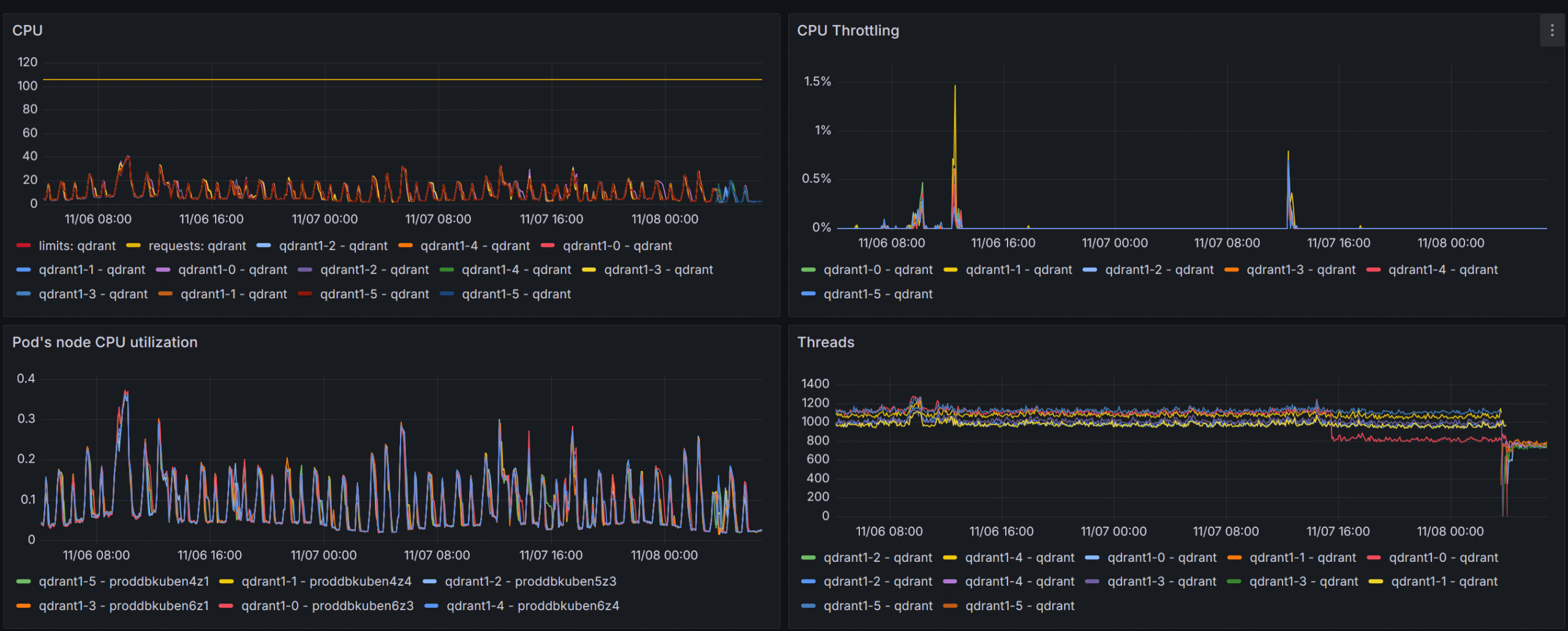 At first, before gaining valuable metrics from the qdrant itself (i.e. before adapting the official Grafana board to our setup), the qdrant nodes were set up to have max_serach_threads of 2048 which lead to throttling at RPS > 1000, which, as I understand, was mainly due to context switching in the engine itself.