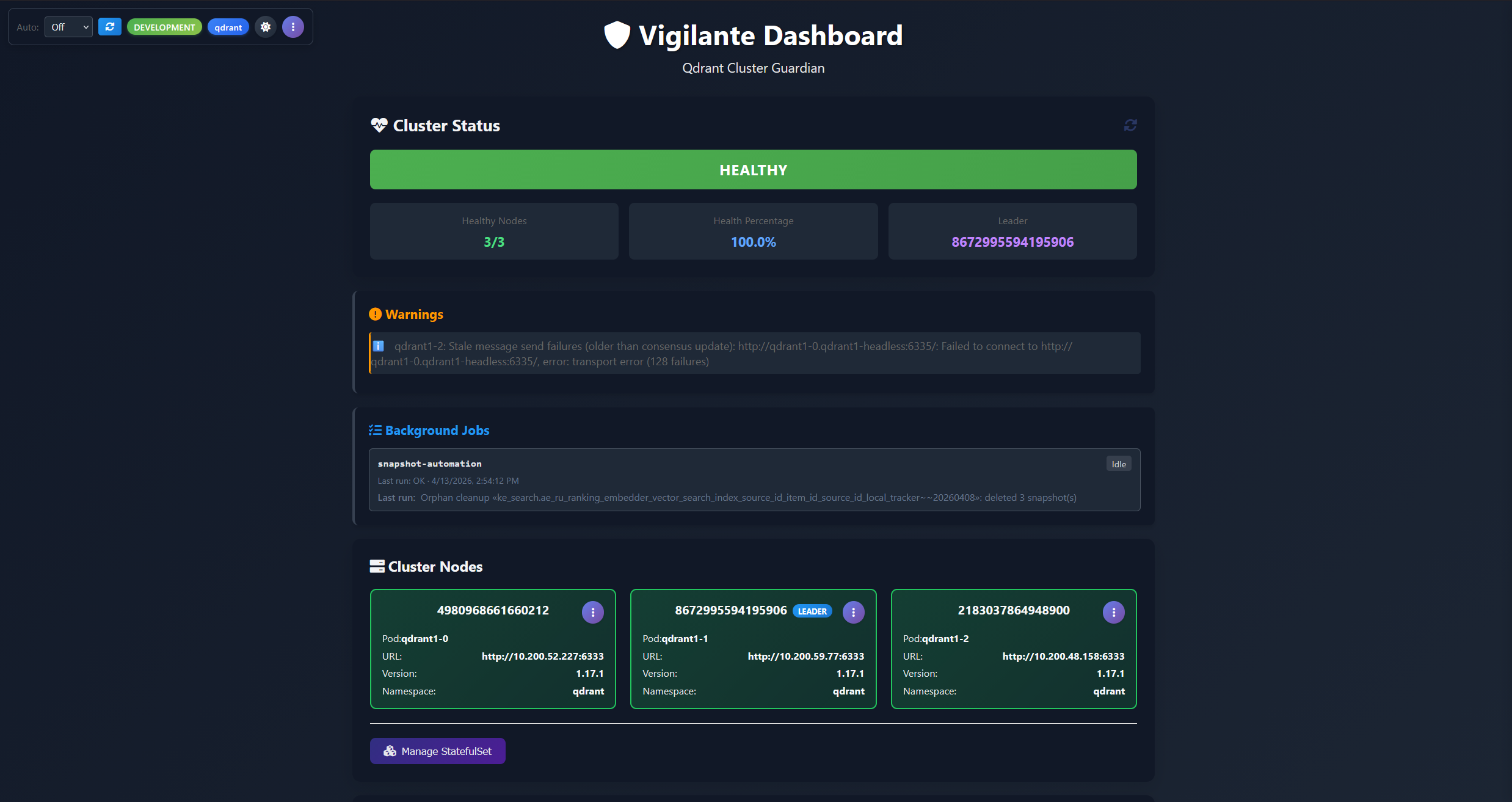 Vigilante is an open-source opinionated cluster management dashboard and automation service for Qdrant, built and open-sourced by the vector search team at AliExpress. The lead developer for the tool lives in Spain hence the name, but at the same time the tool is self-appointed and aggressive… well, you get the pun. It fills exactly the gap described above: a single web UI, backed by a small service running in your Kubernetes cluster as a sidecar to Qdrant nodes, that gives you a unified, cluster-wide view of Qdrant and the operational controls to act on what you see.
