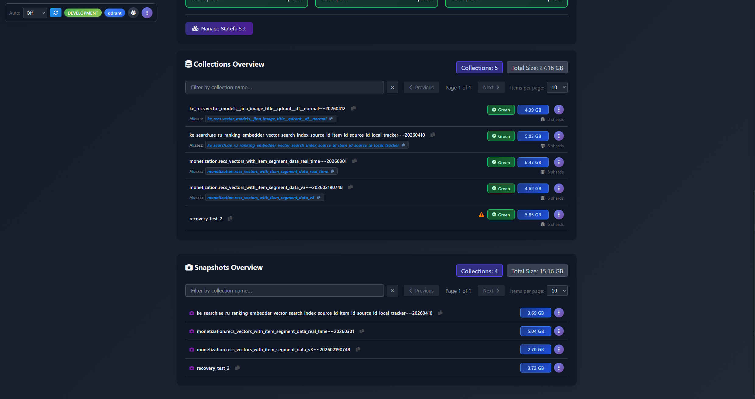 - A collection and snapshot browser that aggregates collection state across all nodes and all backends and storages (Qdrant API, S3, disk) into a single searchable list.
