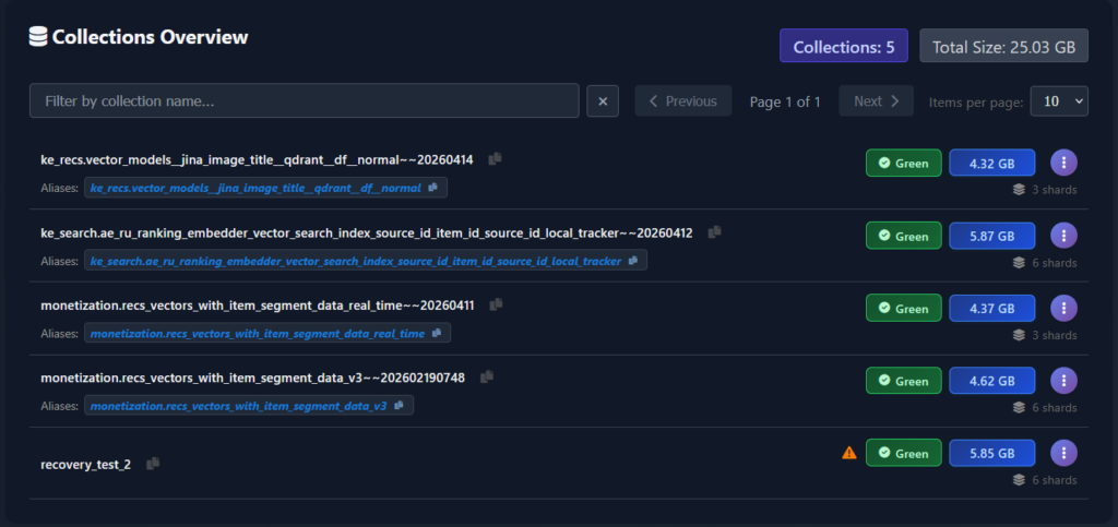 Speaking of filtering: the table has a search box that filters by collection name prefix, a page-size selector, and paginated navigation controls. Production Qdrant clusters can end up with several dozen of collections – though high collection count is discouraged by documentation – and many of the names may start with some team prefixes or other designators. Typing a prefix is by far the fastest way to find the collections you want to inspect. Works only on collection names, does not work by aliases. And does not have fuzzy search — yet.