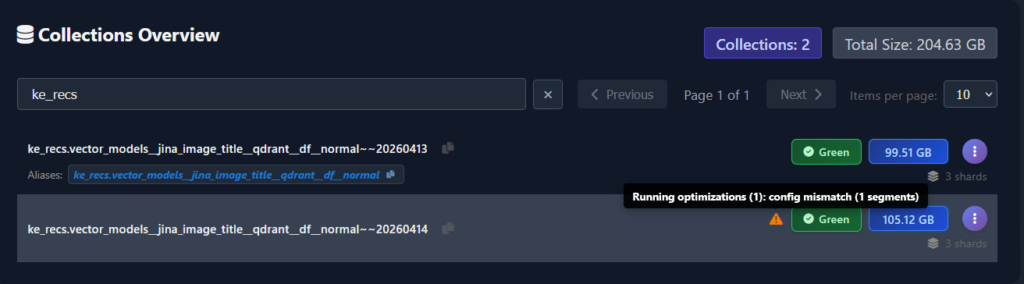- Size in GB – the total on-disk size of the collection, summed across all its shards. This one was the tricky one since when it was added, Qdrant did not report the collection sizes. It still does not report the full size of the collection exactly how it is on disk, that’s why we are getting this info from each pod’s OS. This is the number you want when you’re reasoning about backup volume and storage capacity.