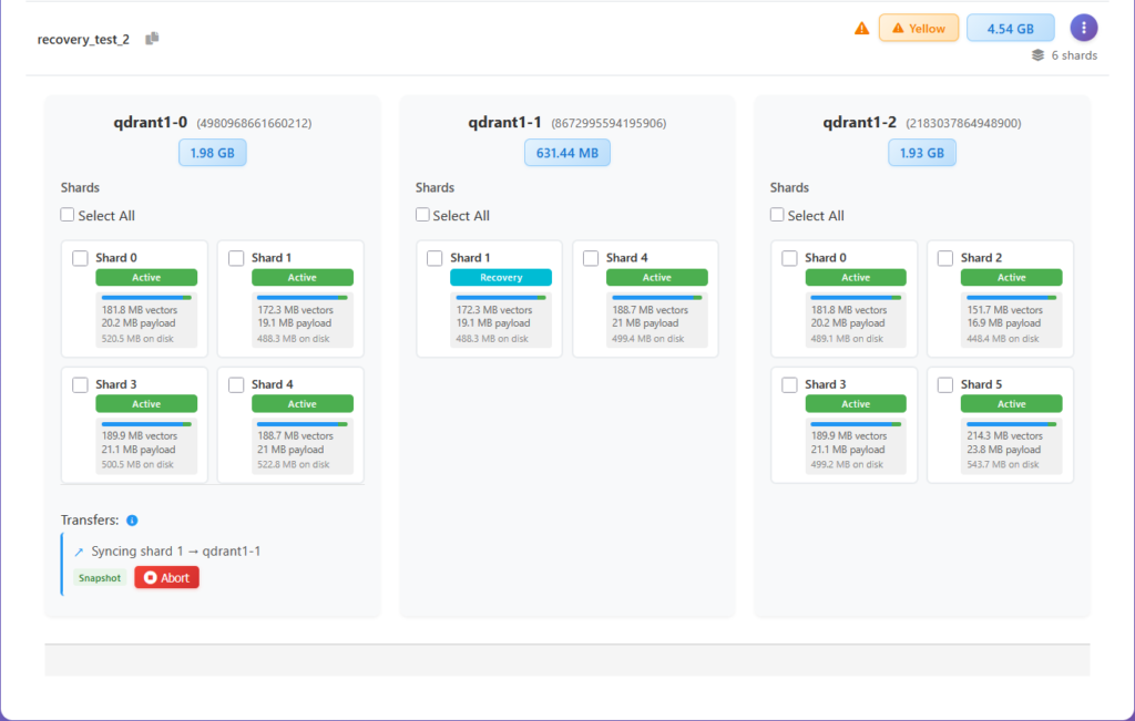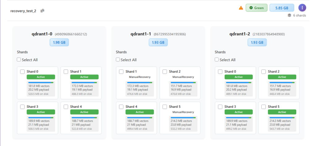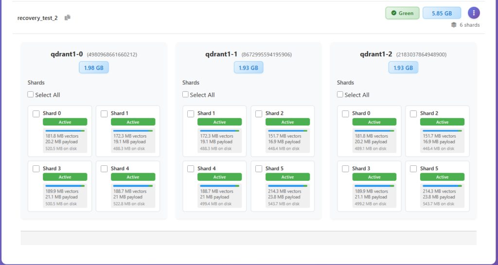 The expanded view is arranged as one card per cluster node, side by side. Each node card carries the pod name, the peer ID next to it, and a size at the top showing how much of the collection is physically stored on that node. Because Qdrant distributes shards across peers, the per-node sizes don’t always divide evenly – at a glance, this view tells you whether a collection is balanced across the cluster or whether one node is carrying disproportionately more data than the others.