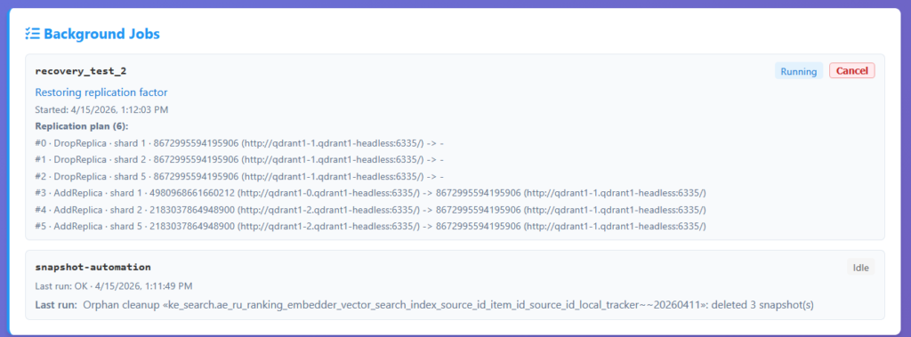 - Restore replication factor – this one is rather special. Our .NET driver has a concept of a compound operation. One method call that internally does multiple things. This is one of those operations. It is useful when you – for any reason – have an unbalanced collection. Meaning that collection shards are not equally distributed between peers, some replicas are dead, or some shards are replicated more times than needed. Basically, it’s “repair what I’ve done” button. It kicks off a background job that walks the collection’s shards on all peers and restores the configured replication factor by copying shards to peers that are missing them, removing extra or dead shard replicas and moving replicas around, so the collection distribution is nice and even. This is the thing you want after say collection recovery failure: rather than manually issuing shard-replication calls, you click one button and a tracked, progress-reported background job takes care of bringing the collection back to full redundancy. The job shows up in the Background Jobs panel (see further article for more details!), with progress messages and an optional cancel button.