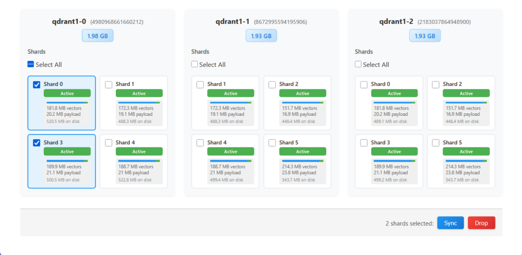 The checkboxes tie into an action bar that appears at the bottom of the expanded view the moment you select at least one shard. The bar is simple: on the left, a count of selected shards, and on the right, two buttons: a blue Sync and a red Drop. Selection works across the node card in the expanded view – you can select any shards on one node to queue them for sync or deletion, letting you act on any arbitrary shard subset in a single operation. Each node card also has a Select All checkbox at the top of its shard grid that selects every shard on that particular node – useful when draining peer one collection at a time.