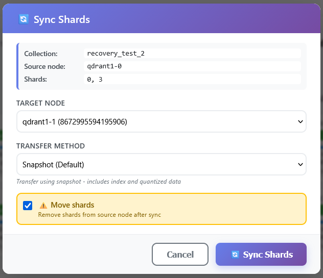 - Sync – replicate the selected shards to a selected target peer. You can choose the replication mode and opt in to move the shards, i.e. to delete them from a source peer after the replication to the target is complete.